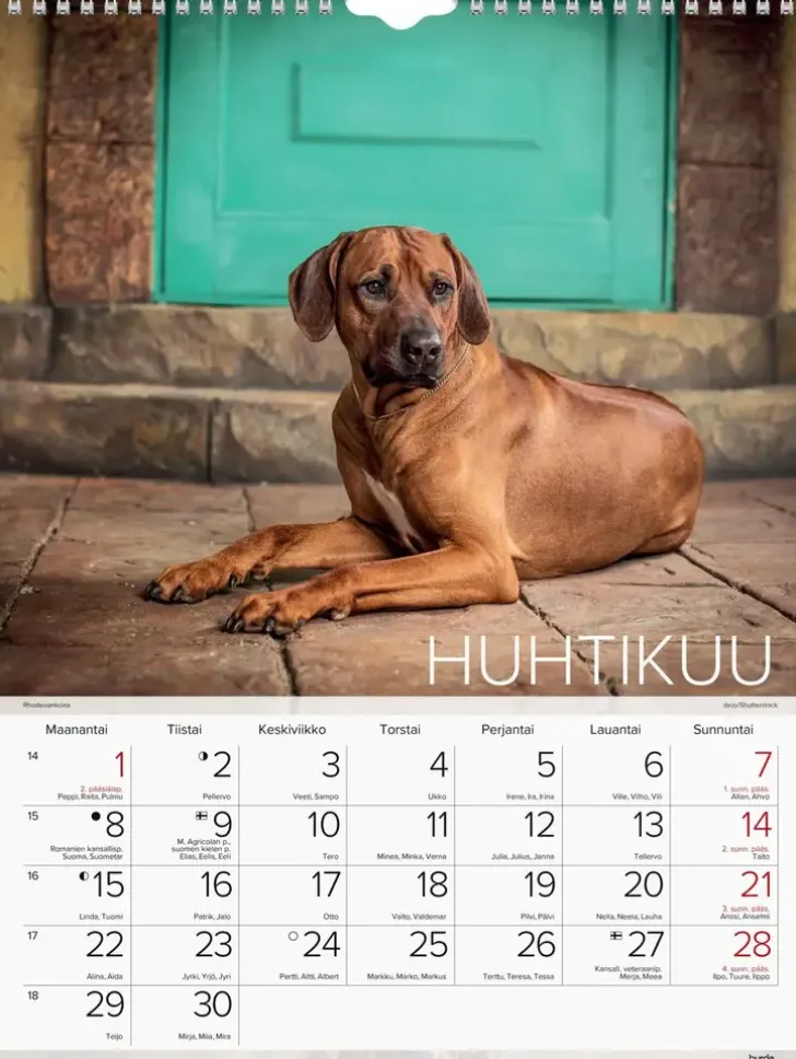 12 Kuvaa Eläinystävistämme. Kalenteri Sisältää Nimipäivät, Liputuspäivät, Kansalliset Pyhäpäivät Ja Kuun Vaiheet. Suomenkielinen. Parikierresidottu. Fsc®. Koko: 295X390 Mm.