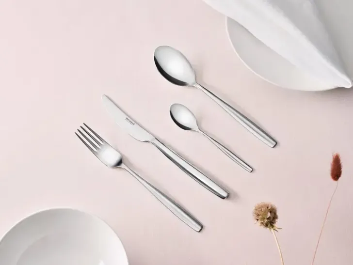 Hienostuneen Carelian Ympärillä Tuntuu Leijuvan Ripaus Juhlatunnelmaa, Mutta Se Sopii Mainiosti Kaunistamaan Myös Tavallista Arkea. Carelia On Varsinainen Klassikko – Yhtä Moderni Ja Miellyttävä Kuin 1963, Jolloin Se Ensi Kerran Esiteltiin. Aterimet Ovat Kiiltävää Ruostumatonta Terästä.