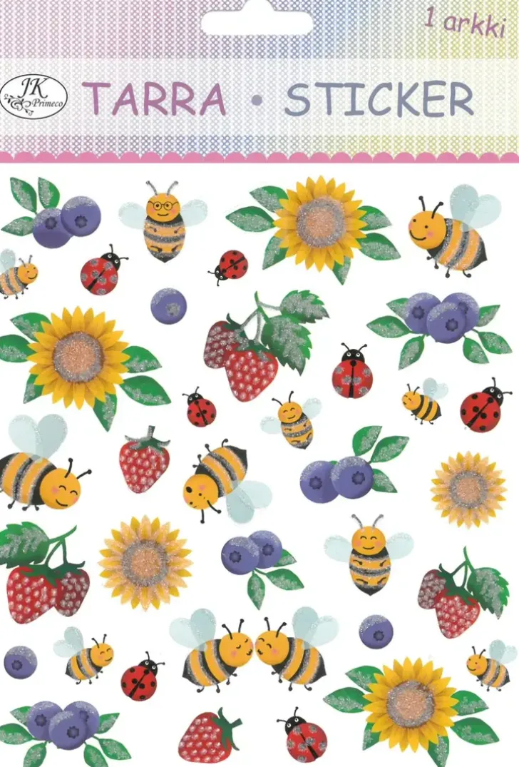Tarra-Arkki Askarteluun Ja Koristeluun. Pakkaus Sisältää Yhden Arkin Erilaisia Paperisia Tarroja Glitterillä. Arkin Koko On N. 15Cm X 17Cm.