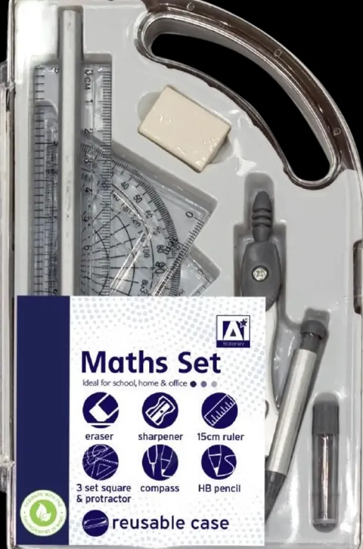 Matikkasetti, Sis. Pyyhekumi, Teroitin, Viivain, Harppi, Lyijykynä, Astelevy-/Kolmioviivaimet