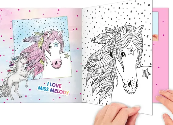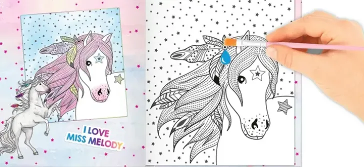 Vesivärihauskaa Miss Melody- Kirjan Parissa! Kostuta Mukana Tuleva Pensseli Vedellä Ja Kostuta Sivun Kuviot, Ja Esiin Tulee Upeat Värit! Hauskoja Taianomaisia Vesivärityshetkiä!