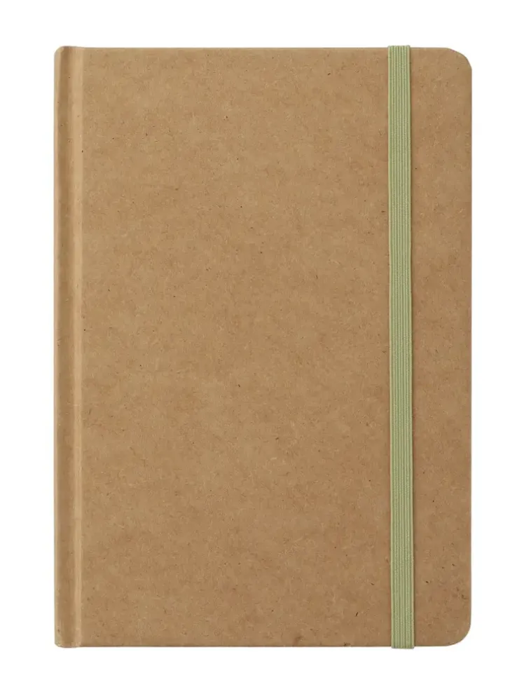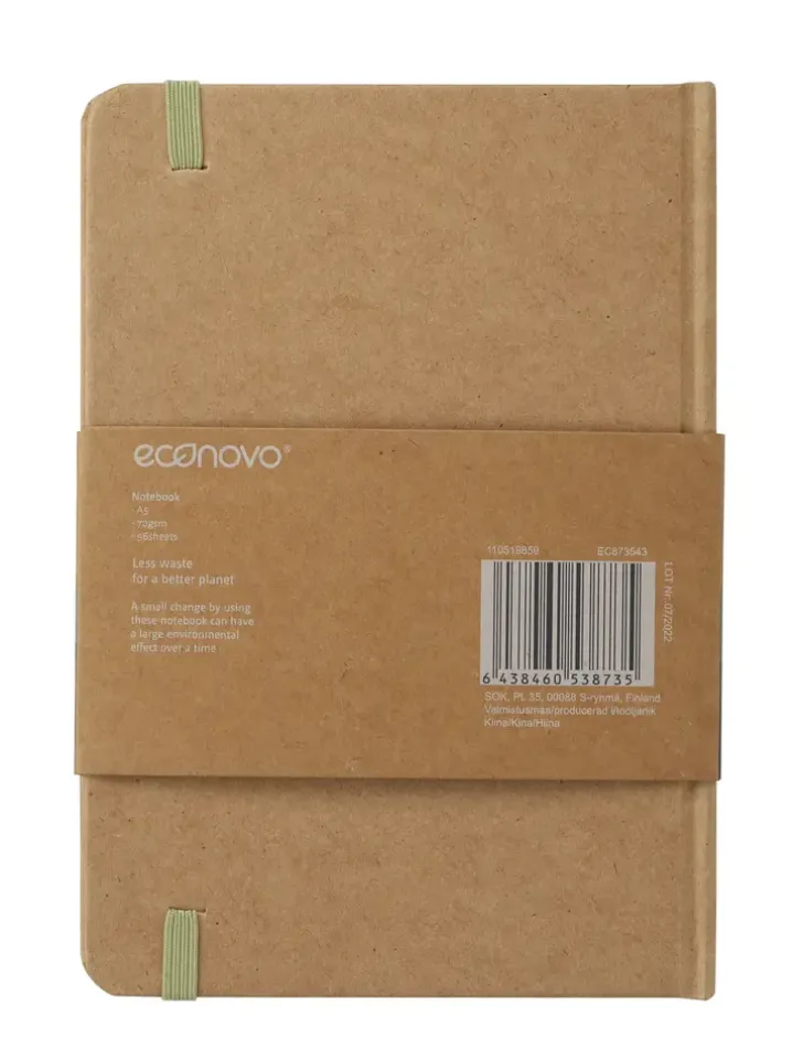 Kierrätetystä Paperista Valmistettu Muistikirja Kuminauhasuljennalla. A5-Kokoinen Muistikirja, Jossa 96 Viivoitettua Sivua. Kirjan Mitat: 14 X 22 X 1 Cm.