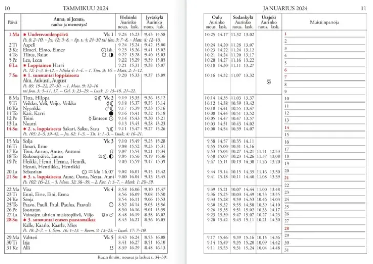 Suurempi Koko Helpottaa Lukemista. Koko 210 X 297 Mm (A4); Stiftattu; 80 Sivua; Yksi Kuukausi Aukeamalla; Aakkosellinen Nimipäiväluettelo; Auringon Ja Kuun Nousu- Ja Laskuajat Monella Paikkakunnalla; Muita Tähtitieteellisiä Tietoja; Säätaulukoita; Kirkolliset Juhlapäivät Sekä Markkina- Ja Toripäivät; Ajankohtainen Artikkeli; Keltaiset Paperikannet; 100 % Suomalainen; Fsc®-Sertifioitu Tuote.
