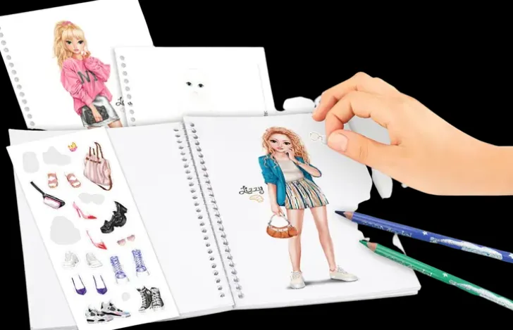 Topmodel-Taskuvärityskirja Kulkee Kanssasi Kaikkialle Näppärän Kokonsa Ansiosta! Kirjan Sivuille Voit Suunnitella Upeita Asukokonaisuuksia Ja Luomuksesi Viimeistelet Mukana Tulevien Tarrojen Avulla!