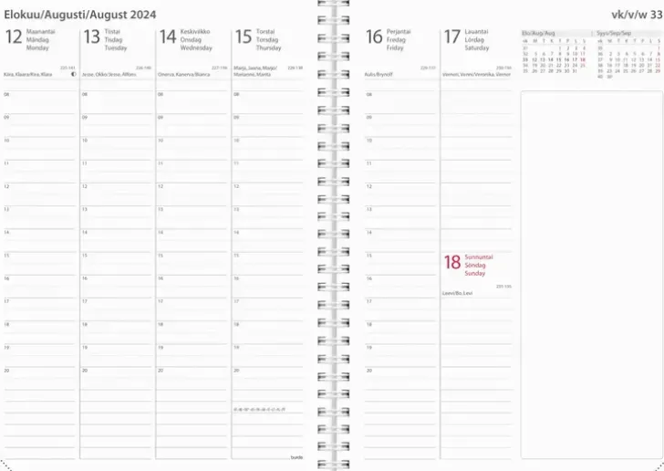 Kartonkikansi Hopeapainatuksella, Kuminauhalla. Kalenterin Aukeamalla Yksi Viikko, Tuntijaotus 08-20, Palsta Muistiinpanoille, Kuluvan Ja Seuraavan Kuukauden Kalenteritaulukot. Kalenteri Sisältää Nimipäivät, Juhlapyhät, Liputuspäivät, Kuun Vaiheet, Vuosisuunnitelmat Kuluvalle Ja Seuraavalle Vuodelle, Vuosiruudukot Edelliselle, Kuluvalle Ja Kahdelle Seuraavalle Vuodelle, Kalendaariset Tiedot, Auringon Nousu- Ja Laskuajat, Yleiset Pyhäpäivät Maailmalla Ja Muistiinpanosivut. Kalenteriosa: Vk 48 2023-Vk 1 2025. Kolmikielinen: Suomi/Ruotsi/Englanti. Parikierresidottu. Fsc®. Koko: 148X210 Mm (A5).