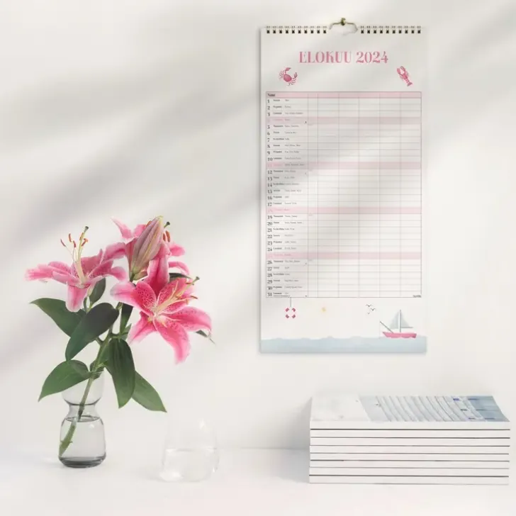12 Sivua. Seinäkalenteri, Jokaisella Aukeamalla Yksi Kuukausi Ja Viisi Sarakketta. Kalenteri Sisältää Suloisia Kuvituksia, Nimipäivät, Liputuspäivät, Juhlapyhät Ja Kuun Vaiheet. Suomenkielinen. Parikierresidottu. Fsc®. Koko: 220X430 Mm.