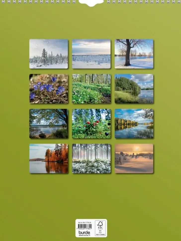 12 Kaunista Luontokuvaa. Aukeamalla Kahden Seuraavan Kuukauden Kalenteritaulukot. Kalenteri Sisältää Nimipäivät, Liputuspäivät, Kansalliset Pyhäpäivät Ja Kuun Vaiheet. Suomenkielinen. Parikierresidottu. Fsc®. Koko: 295X390 Mm.