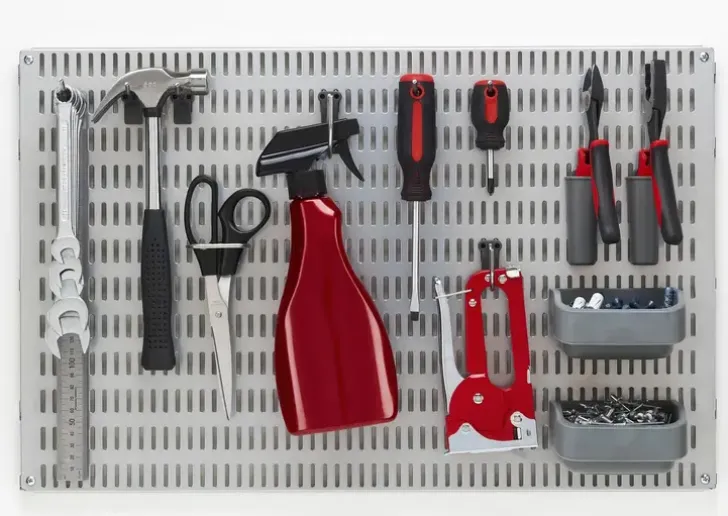 Säilytystaulu, Johon Kuuluu Lajitelma Erilaisia Koukkuja Ja Laatikoita Esimerkiksi Pienten Työkalujen, Ruuvien Ja Naulojen Säilytykseen. Setti Sisältää: 1 Säilytystaulu, 1 Kuppi, 2 Säilytyslaatikkoa, 3 Lyhyttä Työkalukoukkua, 2 Pitkää Työkalukoukkua, 1 Pyöreä Iso Koukku, 1 Pyöreä Pieni Koukku, 1 Pihtikoukku.