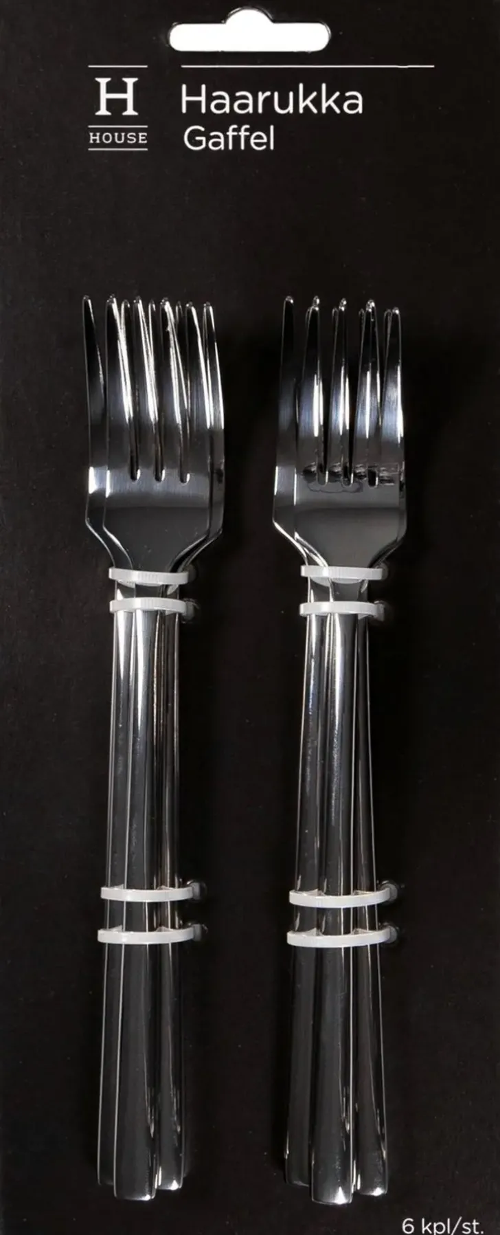 House Scandic -Ruokahaarukka, Kuuden Kappaleen Pakkaus. Valmistettu Ruostumattomasta Teräksestä. Pituus 20,5 Cm. Aterimissa On Soikean Siro, Käteen Mukavasti Asettuva Varsi. House Scandic -Sarjaan Kuuluu Myös Ruokaveitset Ja -Lusikat Sekä Kahvilusikat.