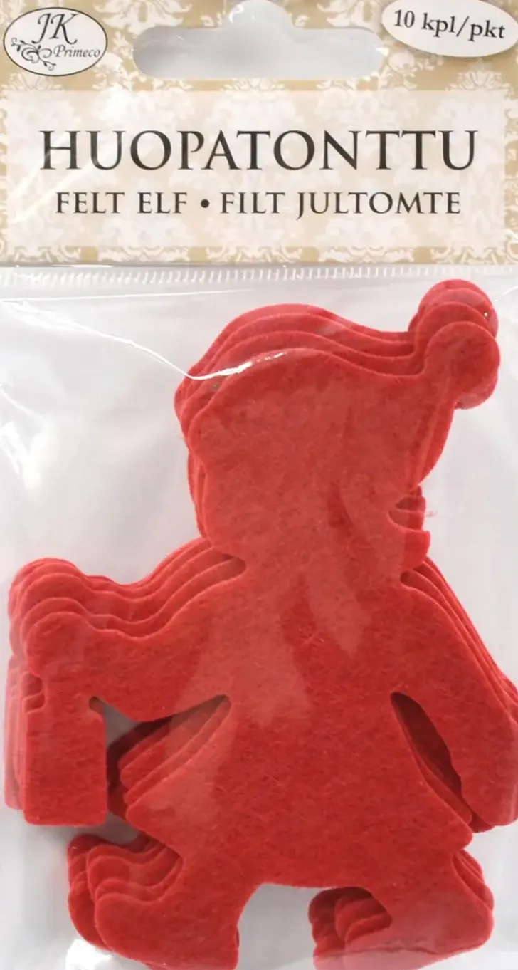 Huopatontut Askarteluun Ja Koristeluun. Pakkaus Sisältää 10 Kappaletta Huovasta Valmistettuja Tonttuja. Yhden Tontun Koko On N. 7,5Cm X 5Cm.
