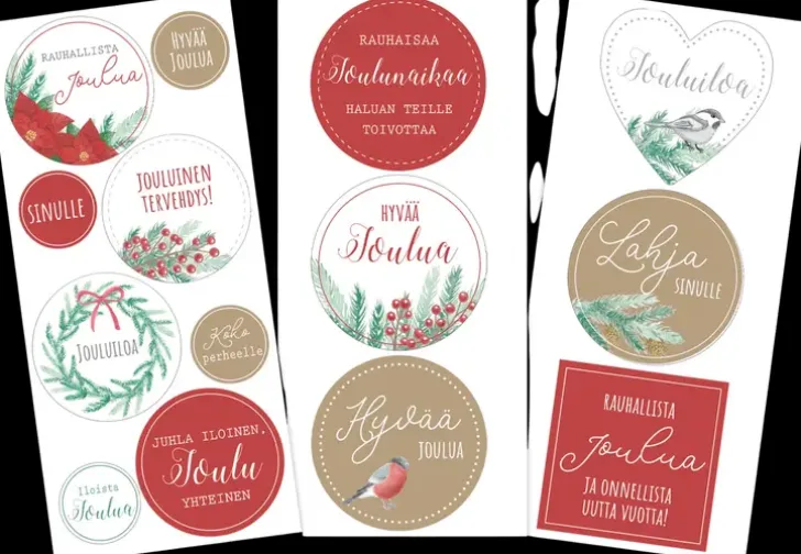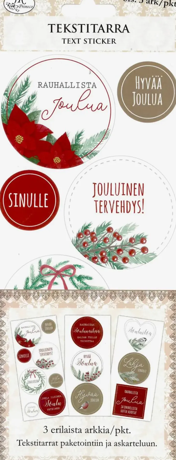 Tekstitarrat Askarteluun, Paketointiin Ja Koristeluun. Sopii Erinomaisesti Korttiaskarteluun Sekä Paketointiin! Pakkaus Sisältää Kolme Arkkia Erilaisia Paperisia Tarroja. Yhden Arkin Koko On N. 23Cm X 10Cm Ja Tarrojen Halkaisijat Ovat N. 3Cm-8Cm.
