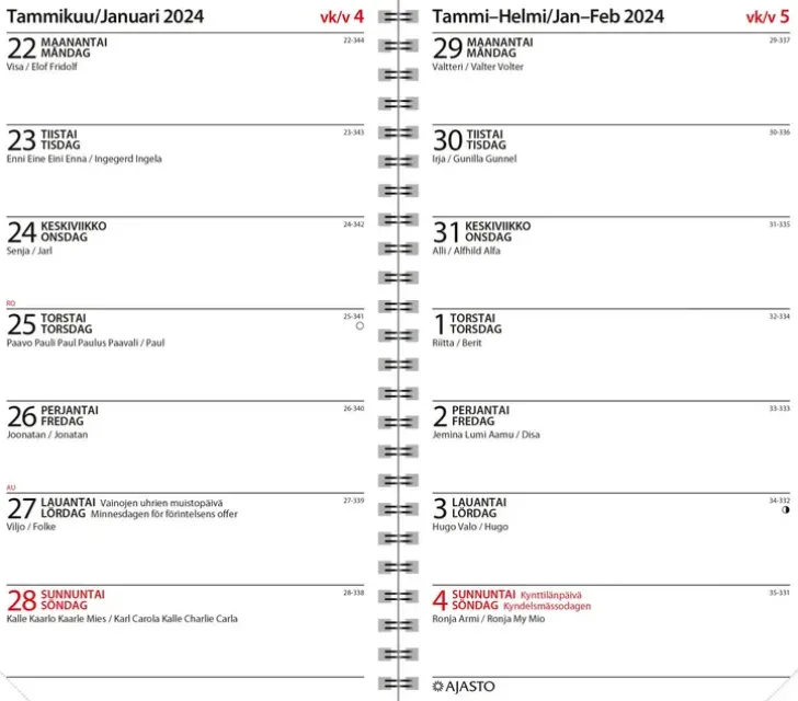 Ympäristöystävällinen Kalenteri Kannesta Kanteen. Koko 120 X 210 Mm; Parikierresidottu; Kielisyys: Suomi, Ruotsi; Päiväkirja 52/2023–1/2025; Vuosisuunnitelmat 2024 Ja 2025; Kaksi Viikkoa Aukeamalla; Suomalaiset Ja Suomenruotsalaiset Nimipäivät; Kansalliset Vapaapäivät; Kuluvan Ja Seuraavan Vuoden Yleiskalendaariot; Liputuspäivät Suomessa; Kiinteä Puhelinmuistio; Tukevat Kierrätyskartonkikannet.