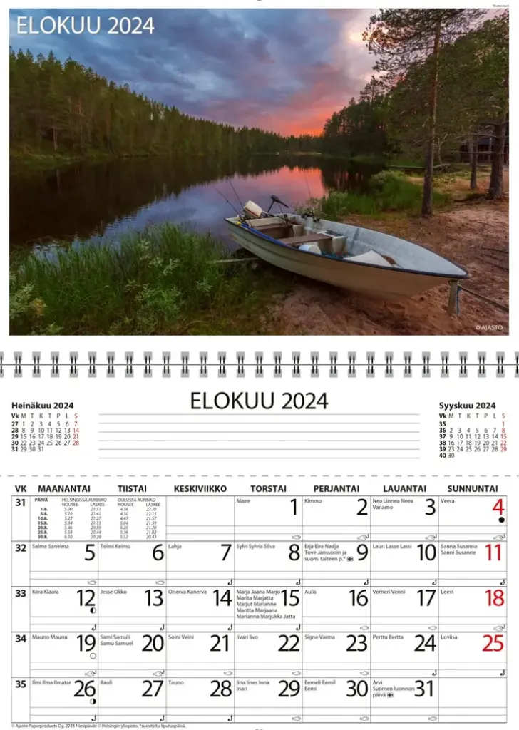 Kertoo, Milloin Kannattaa Lähteä Kalaan. Koko 250 X 176 Mm, Avattuna 250 X 352 Mm; Parikierresidottu; Joka Kuukaudelle Säilytystasku; Auringon Nousu- Ja Laskuajat (Helsinki, Oulu); Kalojen Ottiajat Kalenterisivuilla; Kalenterin Lopussa Ylimääräinen Tasku Mm. Säilytettäville Kuiteille; Värillinen Suomen Kartta; Soveltuu Hyvin Postitettavaksi Kirjekuoressa; Nimi- Ja Juhlapäivät; Fsc®-Sertifioitu Tuote.
