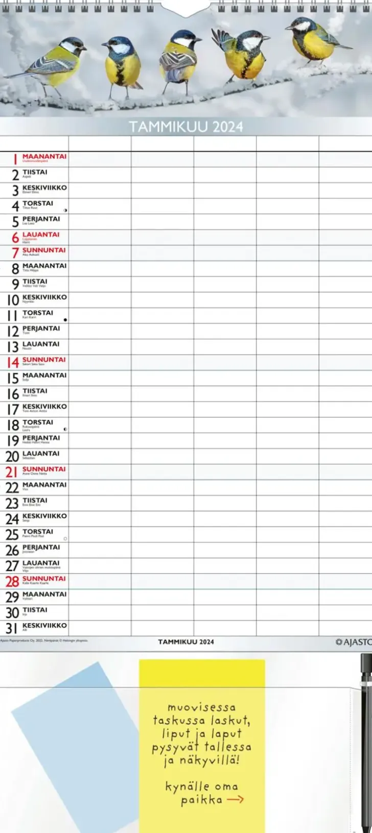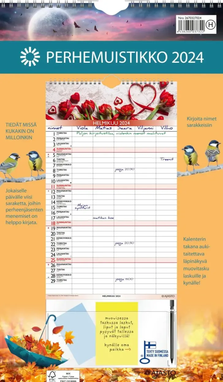 Tiedät Perheesi Menemiset Ja Tulemiset. Koko 250 X 415 Mm; Parikierresidottu; Jokaiselle Päivälle Viisi Saraketta, Joihin Perheenjäsenten Menemiset On Helppo Kirjata; Kätevä Muovitasku Laskuille Ja Kynälle; Nimi- Ja Juhlapäivät; Avainlippu-Tuote; Fsc®-Sertifioitu Tuote.