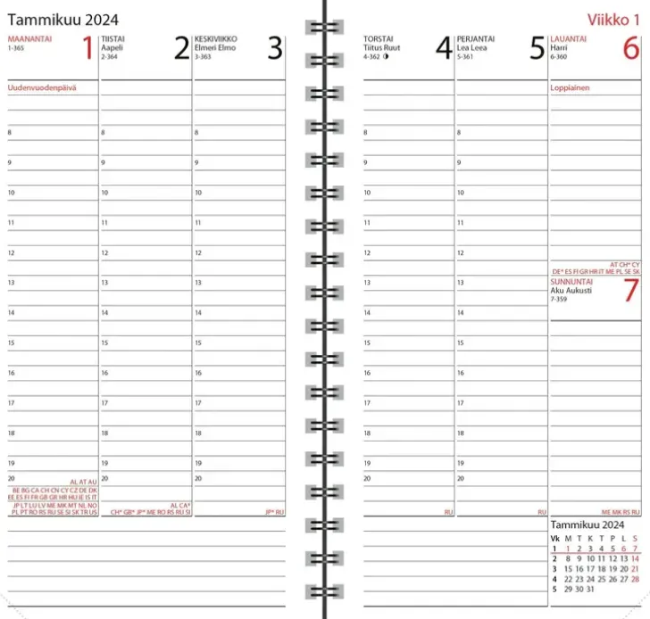 Klassikkokalenteri Päivittäiseen Käyttöön. Koko 85 X 162 Mm; Leatherette-Kannet; Parikierresidottu; Aukeamalla Viikkonäkymä; Päiväkirja 48/2023–2/2025; Vuosisuunnitelmat 2024 Ja 2025; Kansalliset Vapaapäivät; Suomalaiset Nimipäivät; Muistiinpanosivuja; Euroopan Kartta; Kynänpidike; Avainlippu-Tuote; Fsc®-Sertifioitu Tuote.