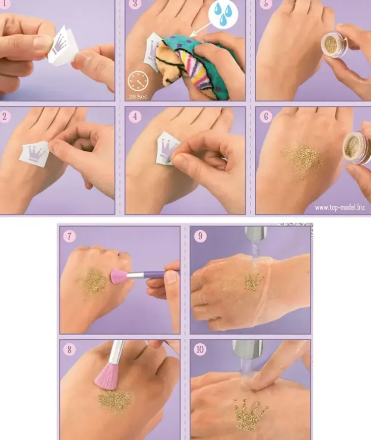 Upea Kimalletatuointisetti, Jossa Mukana Pohjat Erilaisiin Tatuointeihin, Pensseli Sekä Valkoinen, Hopeinen Ja Kultainen Kimallejauhe. Näillä Luot Ihollesi Kimaltelevan Säihkyvät Katseenvangitsijat!