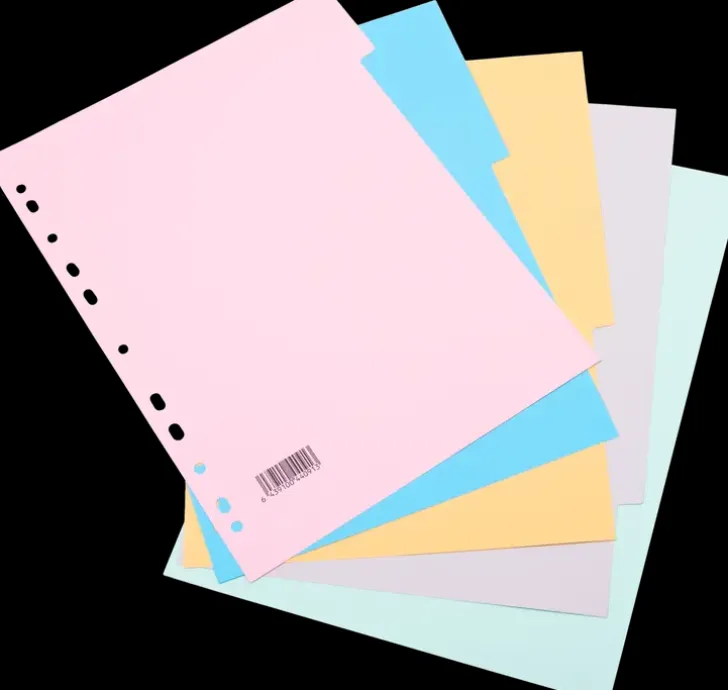 Välilehti A4 Kokoisille Arkeille. Värilliset Lehdet, Viisiosainen. Monireiitys, Joka Sopii Lähes Kaikkiin Mappeihin Ja Kansioihin. Välilehden Ulkomitat 225 X 298 Mm.